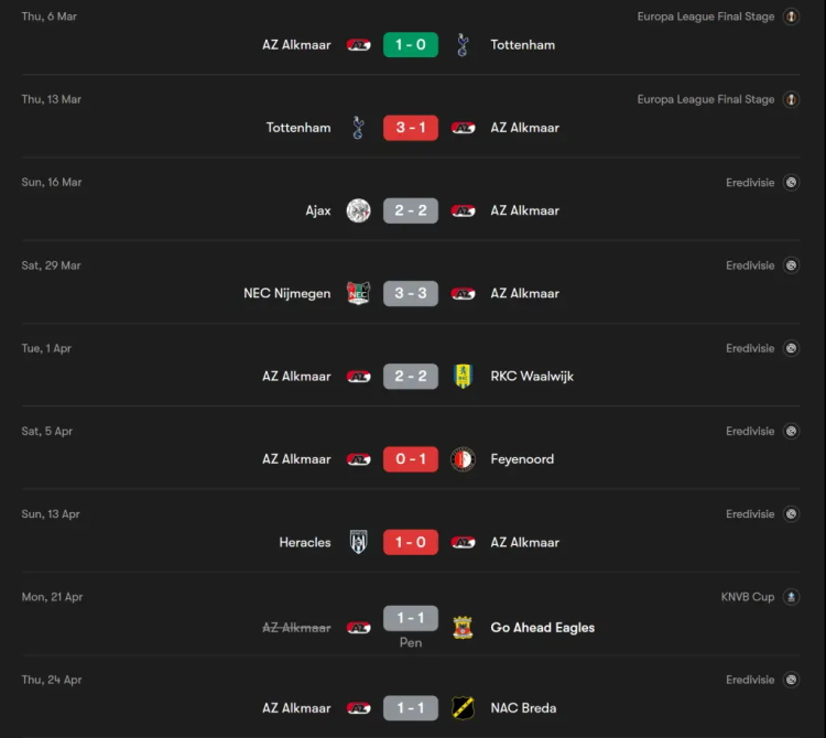 The team faltered under the strain of several key competitions, and this all seemed to come together for a rotten April. Here, the AFAS Stadion residents slipped down out of European contention, struggled in the wake of exiting the Europa League at the quarter-final stage, and lost the KNVB Cup final to Go Ahead Eagles on penalties.