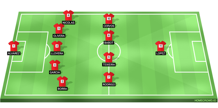 Probable Lineup (5-4-1): Alvarez; Borra, Garcia, Llovera, Olivera, Nicolas; Rodrigo, Babot, Teixeira, Cervós, López