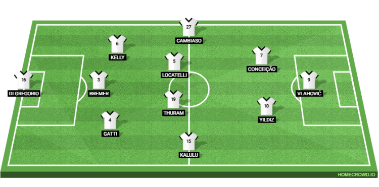 Probable Lineup (3-4-2-1): Di Gregorio; Gatti, Bremer, Kelly; Kalulu, Thuram, Locatelli, Cambiaso; Conceicao, Yildiz; Vlahovic