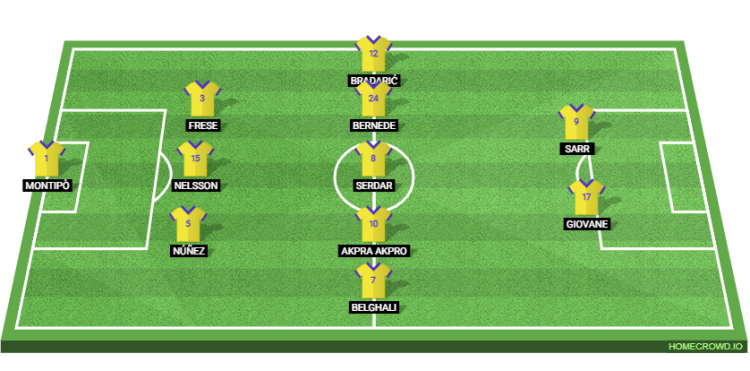 Lorenzo Montipo will start in goal, shielded by a three-man defence consisting of Unai Nunez, Victor Nelsson, and Martin Frese. On the flanks, Rafik Belghali will provide width on the right, while Domagoj Bradaric takes charge of the left wing-back role.