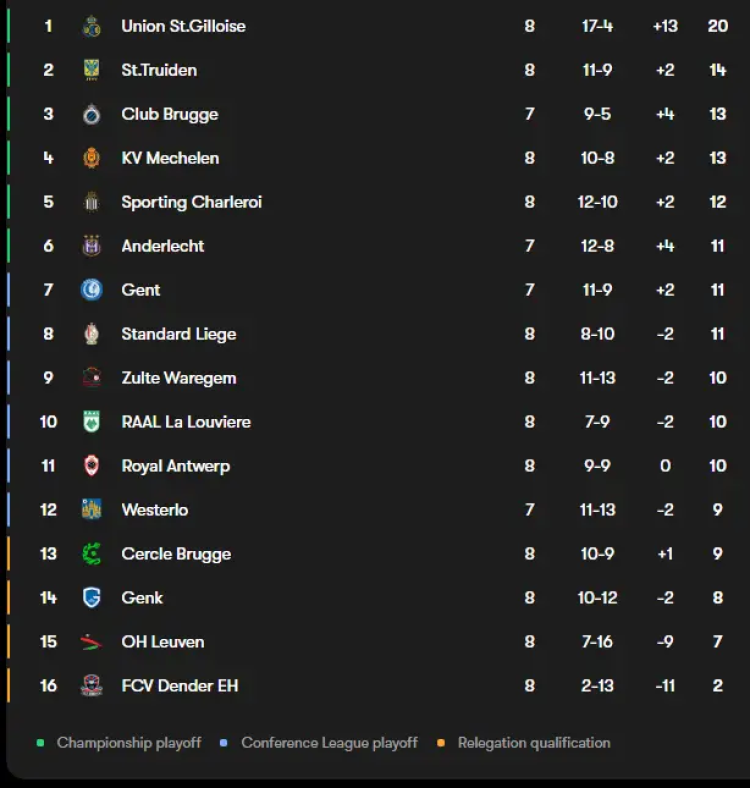Union St Gilloise left it late to ensure Genk went pointless and endured their worst start to a season for over 20 years. Promise David gave a tired looking Union the lead, only for Junya Ito to score his first goal since returning from Genk before the hour mark. Late on, former KV Mechelen captain Rob Schoofs came off the bench to grab his first goal for the club and keep Union clear at the top of the table.