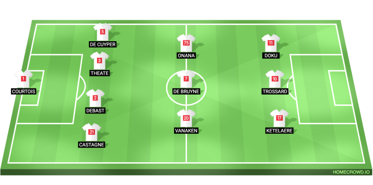 Probable Lineup (4-3-3): Courtois; Castagne, Debast, Theate, De Cuyper; Vanaken, De Bruyne, Onana; Ketelaere, Trossard, Doku