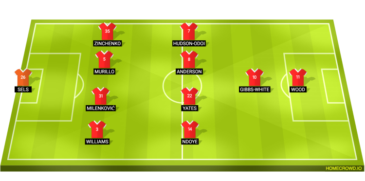 Probable Lineup (4-4-1-1): Sels; Williams, Milenkovic, Murillo, Zinchenko; Ndoye, Yates, Anderson, Hudson-Odoi; Gibbs-White; Wood