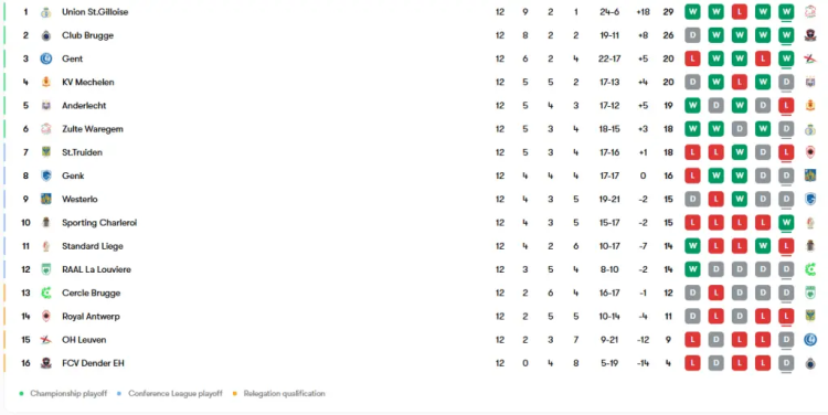 With 12 rounds now complete in the Belgian Pro League, the table is finally starting to take some sort of shape. The middle remains congested, while at the bottom Dender are beginning to be cut adrift.