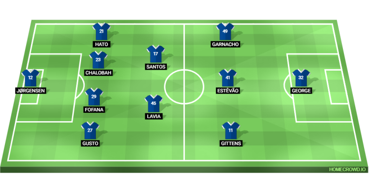 Predicted Chelsea XI: Jorgensen; Gusto, Fofana, Chalobah, Hato; Lavia, Santos; Gittens, Estevao, Garnacho; George