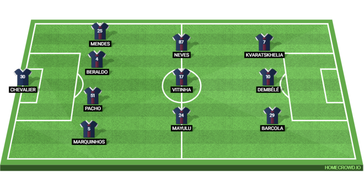 Probable Lineup (4-3-3): Chevalier; Marquinhos, Pacho, Beraldo, Mendes; Mayulu, Vitinha, Neves; Barcola, Dembele, Kvaratskhelia