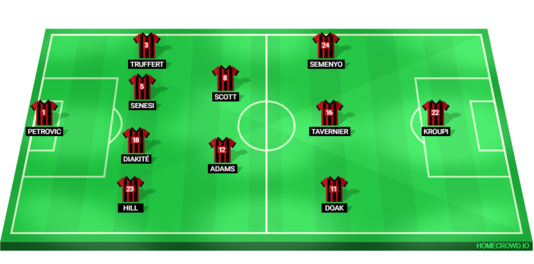 Bournemouth (4-2-3-1): Petrovic, Hill, Diakite, Senesi, Truffert; Adams, Scott; Doak, Tavernier, Semenyo; Kroupi