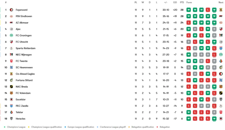 Feyenoord bounced back from last weekends defeat to PSV with a comfortable home win over newly promoted FC Volendam. Ayase Ueda grabbed two to give him 13 Eredivisie goals in just 11 games. Sem Steijn grabbed his sixth since joining from FC Twente in the summer. However, Volendam had made it 2-1 for half an hour or so in the second half after a goal from veteran striker Henk Veerman. Feyenoord move back top on goal difference while Volendam remain just outside of the bottom three.