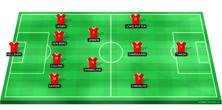 Probable Lineup (4-2-3-1): Kelleher; Kayode, Collins, van den Berg, Henry; Yarmolyuk, Jensen; Carvalho, Damsgaard, Lewis-Potter; Thiago