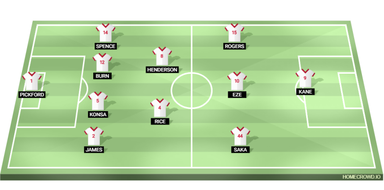 Probable England Lineup (4-2-3-1): Pickford; James, Konsa, Burn, Spence; Rice, Henderson; Saka, Eze, Rogers; Kane
