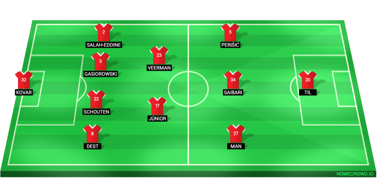 Probable Lineup (4-2-3-1): Kovar; Dest, Schouten, Gasiorowski, Salah-Eddine; Junior, Veerman; Man, Saibari, Perisic; Til