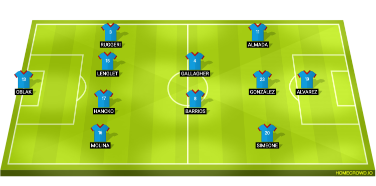 Probable Lineup (4-2-3-1): Oblak; Molina, Hancko, Lenglet, Ruggeri; Gallagher, Barrios; Simeone, Gonzalez, Almada; Alvarez