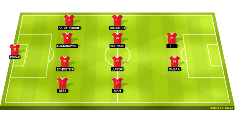 Sergino Dest and Anass Salah-Eddine will keep their spots in the full-back roles. Bosz will likely use a 4-4-2, with Ismael Saibari and Gus Til in the two-prong attacking setup, while Dennis Man and Driouech will provide the width in the system.