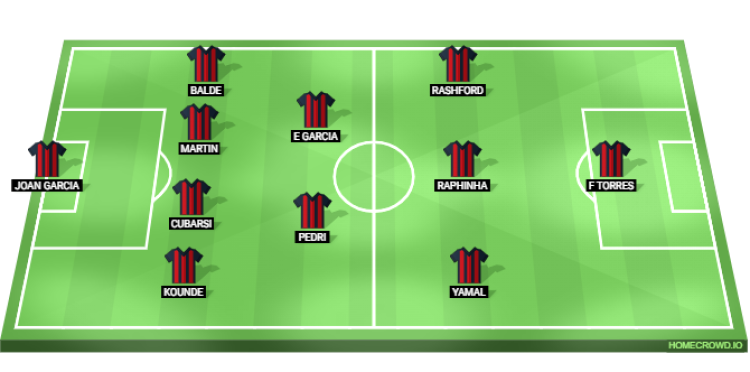 Predicted Barcelona XI: Joan Garcia; Kounde, Cubarsi, Martin, Balde; Pedri, Eric Garcia; Yamal, Raphinha, Rashford; Ferran Torres