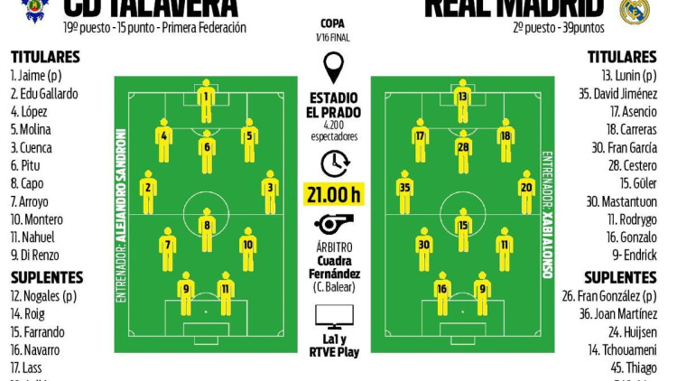 Although Alonso will rotate, Diario AS predict a strong side to face Talavera. It is worth noting that rules dictate only three academy players can play at one time, and as Franco Mastantuono is registered as a Castilla player, he counts towards that amount. Mastantuono looks set to start his first game since the first of November, after recovering from a sports hernia.