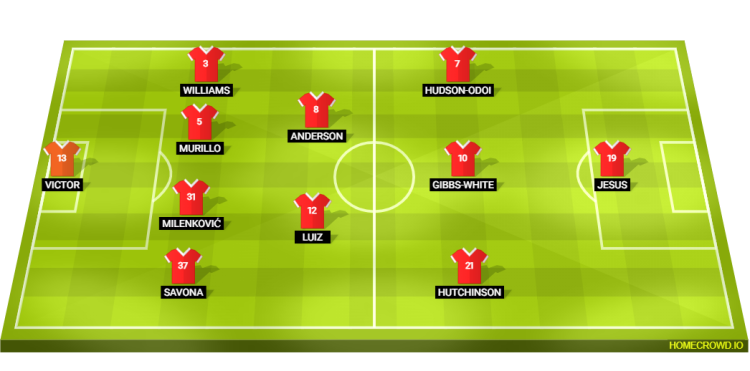 Probable Lineup (4-2-3-1): John Victor; Savona, Milenkovic, Murillo, Williams; Douglas Luiz, Anderson; Hutchinson, Gibbs-White, Hudson-Odoi; Igor Jesus