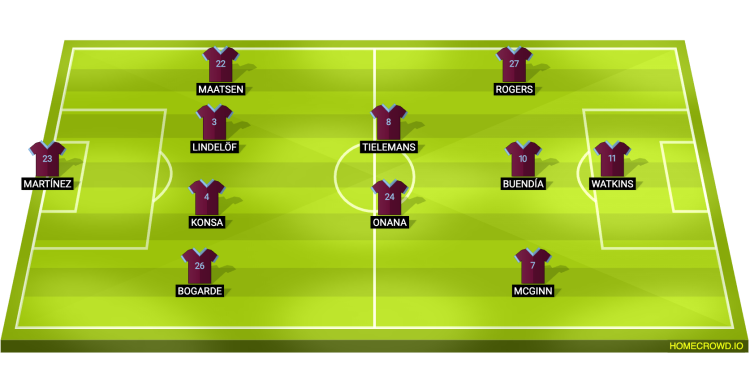 Probable Lineup (4-2-3-1): Martinez; Bogarde, Konsa, Lindelof, Maatsen; Onana, Tielemans; McGinn, Buendia, Rogers; Watkins