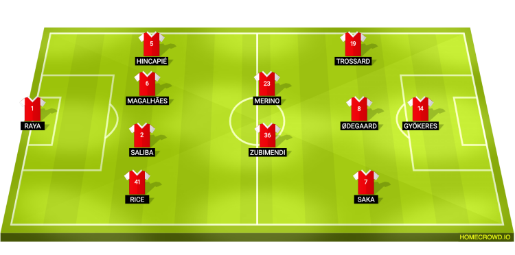 Probable Lineup (4-2-3-1): Raya; Rice, Saliba, Gabriel, Hincapie; Zubimendi, Merino; Saka, Odegaard, Trossard; Gyokeres
