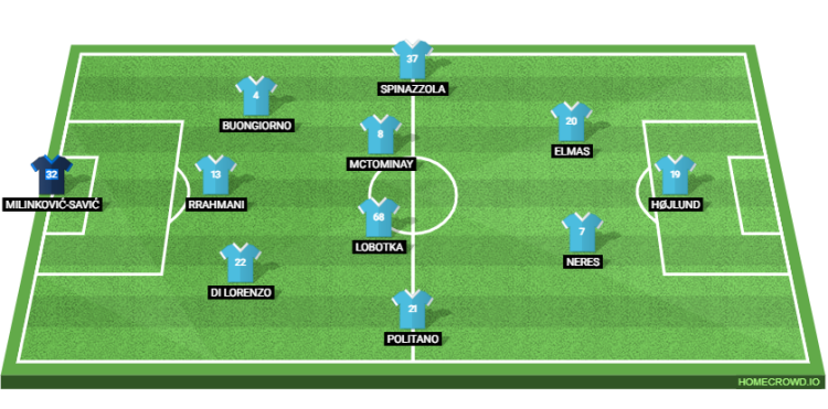 Probable Lineup (3-4-2-1): Milinkovic-Savic; Di Lorenzo, Rrahmani, Buongiorno; Politano, Lobotka, McTominay, Spinazzola; Neres, Elmas; Hojlund
