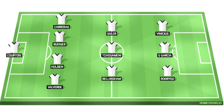 Predicted Real Madrid XI: Courtois; Valverde, Huijsen, Rudiger, Carreras; Bellingham, Tchouameni, Guler; Rodrygo, Gonzalo Garcia, Vinicius Junior