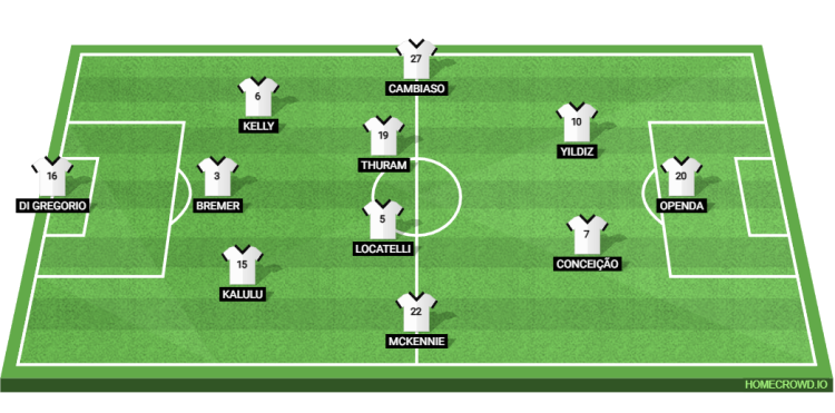 Probable Lineup (3-4-2-1): Di Gregorio; Kalulu, Bremer, Kelly; McKennie, Locatelli, Thuram, Cambiaso; Concecicao, Yildiz; Openda