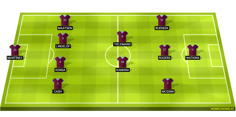 Probable Lineup (4-2-3-1): Martinez; Cash, Konsa, Lindelof, Maatsen; Kamara, Tielemans; McGinn, Rogers, Buendia; Watkins
