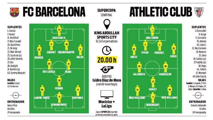Barcelona and Athletic Club will kick off the Spanish Supercup on Wednesday night at 20:00 CEST in Jeddah, Saudi Arabia, the first of two semi-finals. Atletico Madrid and Real Madrid will do battle on Thursday, with the final taking place on Sunday evening.
