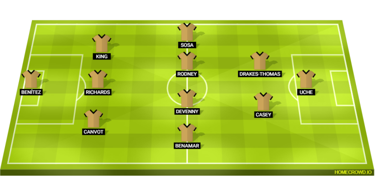 Probable Lineup (3-4-2-1): Benitez; Canvot, Richards, King; Benamar, Devenny, Rodney, Sosa; Casey, Drakes-Thomas; Uche
