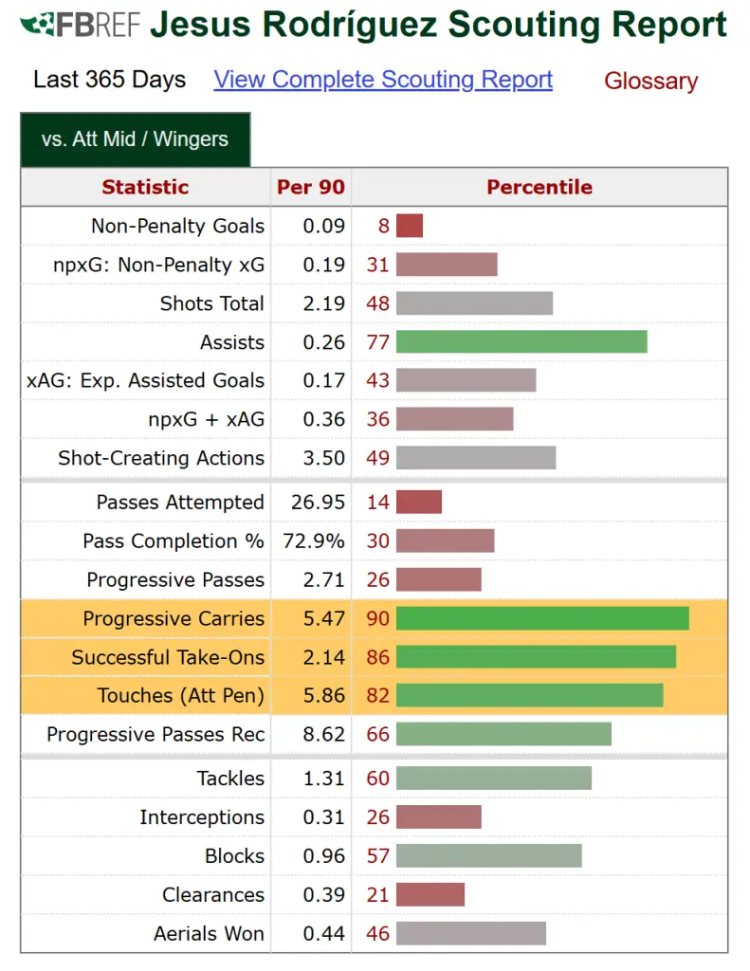So, why the hype around Rodriguez? Well, with a style akin to Napoli man David Neres, the Seville-born left-sider has turned heads with his quick dribbling and artful nature on the ball. As on-the-button stats website FBREF shows, Rodriguez sits favourably when compared to positional peers in Men’s Big 5 Leagues, UCL, and UEL competitions.