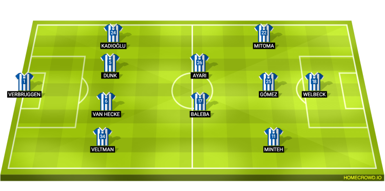 Probable Lineup (4-2-3-1): Verbruggen; Veltman, van Hecke, Dunk, Kadioglu; Baleba, Ayari; Minteh, Gomez, Mitoma; Welbeck