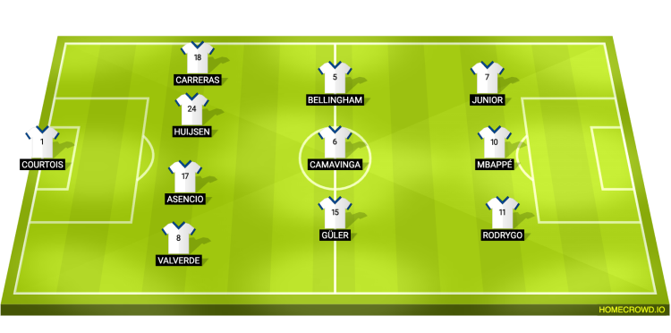 Probable Lineup (4-3-3): Courtois; Valverde, Huijsen, Asencio, Carreras; Guler, Camavinga, Bellingham; Rodrygo, Mbappe, Vinicius