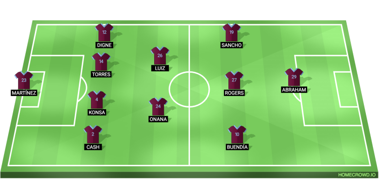 Probable Lineup (4-2-3-1): Martinez; Cash, Konsa, Torres, Digne; Onana, Luiz; Buendia, Rogers, Sancho; Abraham