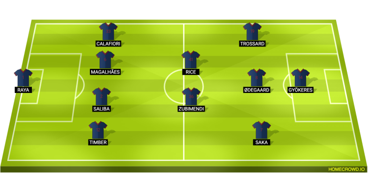 Predicted Arsenal XI: Raya; Timber, Saliba, Gabriel, Calafiori; Zubimendi, Rice; Saka, Odegaard, Trossard; Gyokeres
