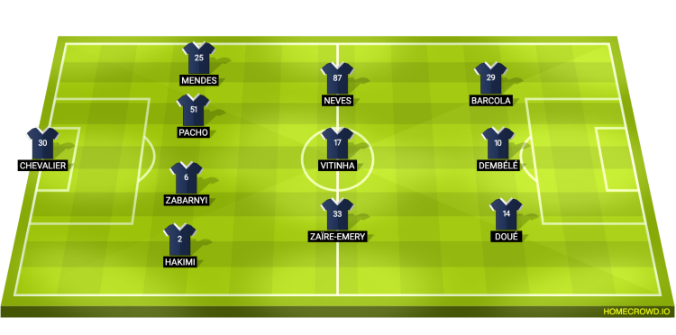 Probable Lineup (4-3-3): Chevalier; Hakimi, Zabarnyi, Pacho, Mendes; Zaire-Emery, Vitinha, Neves; Doue, Dembele, Barcola