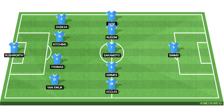 Probable Lineup (4-5-1): Rushworth; Van Ewijk, Thomas, Kitching, Dasilva; Eccles, Grimes, Sakamoto, Rudoni, Esse; Simms