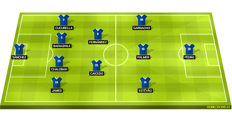 Predicted Chelsea XI: Sanchez; Gusto, Chalobah, Badiashile, Cucurella; Caicedo, Fernandez; Estevao, Palmer, Garnacho; Pedro