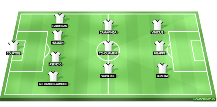 The team in white will line up in a 4-3-3 formation, where Thibaut Courtois will be in goal. Trent Alexander-Arnold and Alvaro Carreras will feature as the full-backs, while Raul Asencio should partner Dean Huijsen in the heart of the defence.