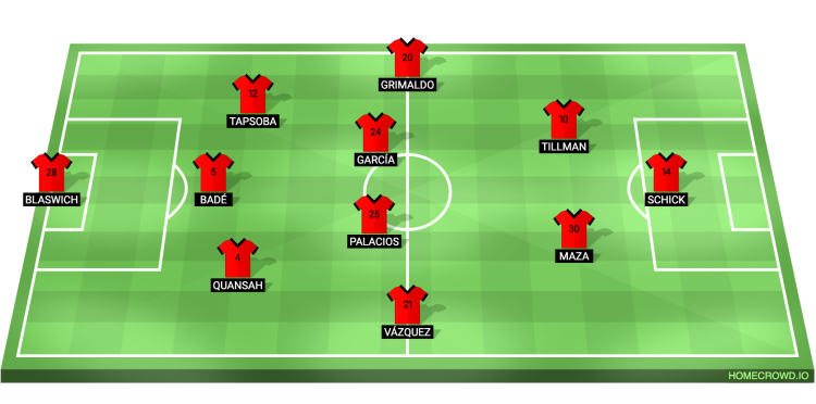 Probable Lineup (3-4-2-1): Blaswich; Quansah, Bade, Tapsoba; Vazquez, Garcia, Palacios, Grimaldo; Maza, Tillman; Schick
