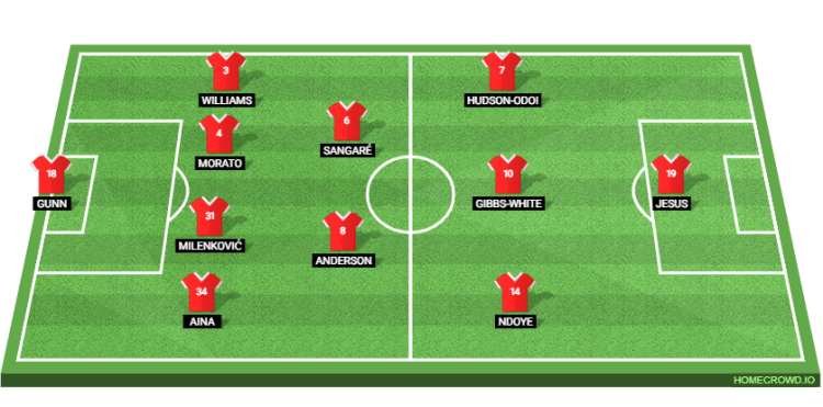 Probable Lineup (4-2-3-1): Gunn; Aina, Milenkovic, Morato, Williams; Anderson, Sangare; Ndoye, Gibbs-White, Hudson-Odoi; Jesus