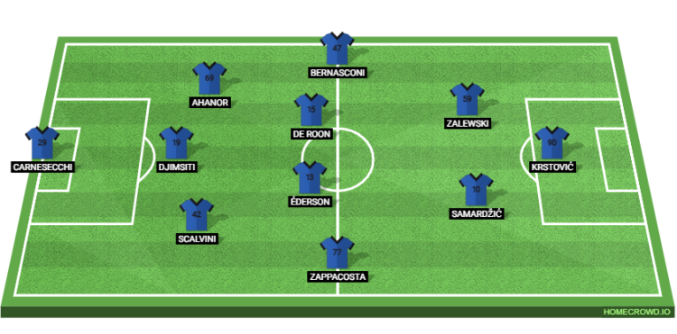 In midfield, Davide Zappacosta is projected to feature as the right wing-back, with Lorenzo Bernasconi operating on the left flank. The central midfield pairing should see Ederson alongside Marten de Roon, combining physical presence with ball progression.
