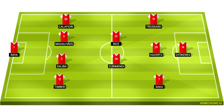 Viktor Gyokeres is widely expected to lead the line, while Leandro Trossard could return on the left wing. Should one of Odegaard, Havertz or Eze start in the No. 10 role, Bukayo Saka could be the starter on the right, at the expense of Noni Madueke.