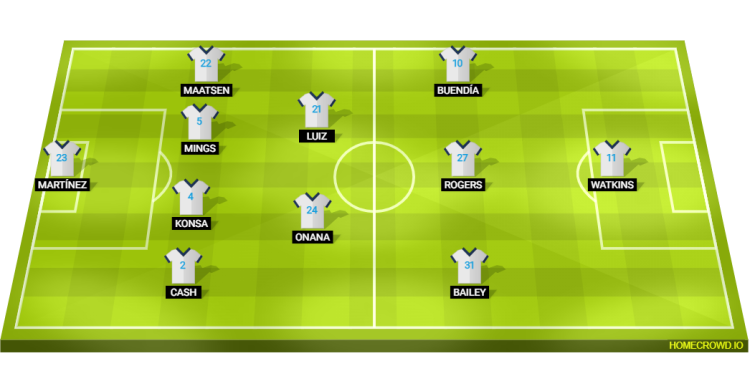Probable Lineup (4-2-3-1): Martinez; Cash, Konsa, Mings, Maatsen; Onana, Luiz; Bailey, Rogers, Buendia; Watkins
