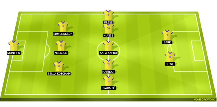 Probable Lineup (3-5-2): Montipo; Bella-Kotchap, Nelsson, Edmundsson; Bradaric, Harroui, Akpa-Akpro, Niasse, Frese; Bowie, Sarr
