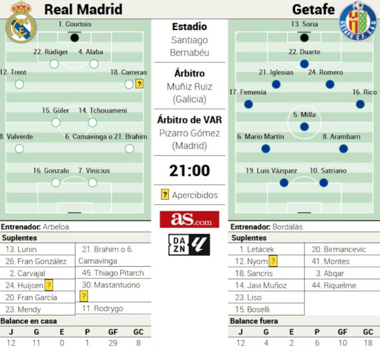 As per Diario AS, Arbeloa has two doubts going into the match with Getafe, and at the heart of them are Camavinga and Huijsen. The former will start if he is deemed fit enough to play, but if not, the likelihood is that he would be replaced by Brahim Diaz. As for Huijsen, he has chances to be named in the line-up, although it is more likely that Antonio Rudiger and David Alab are selected.