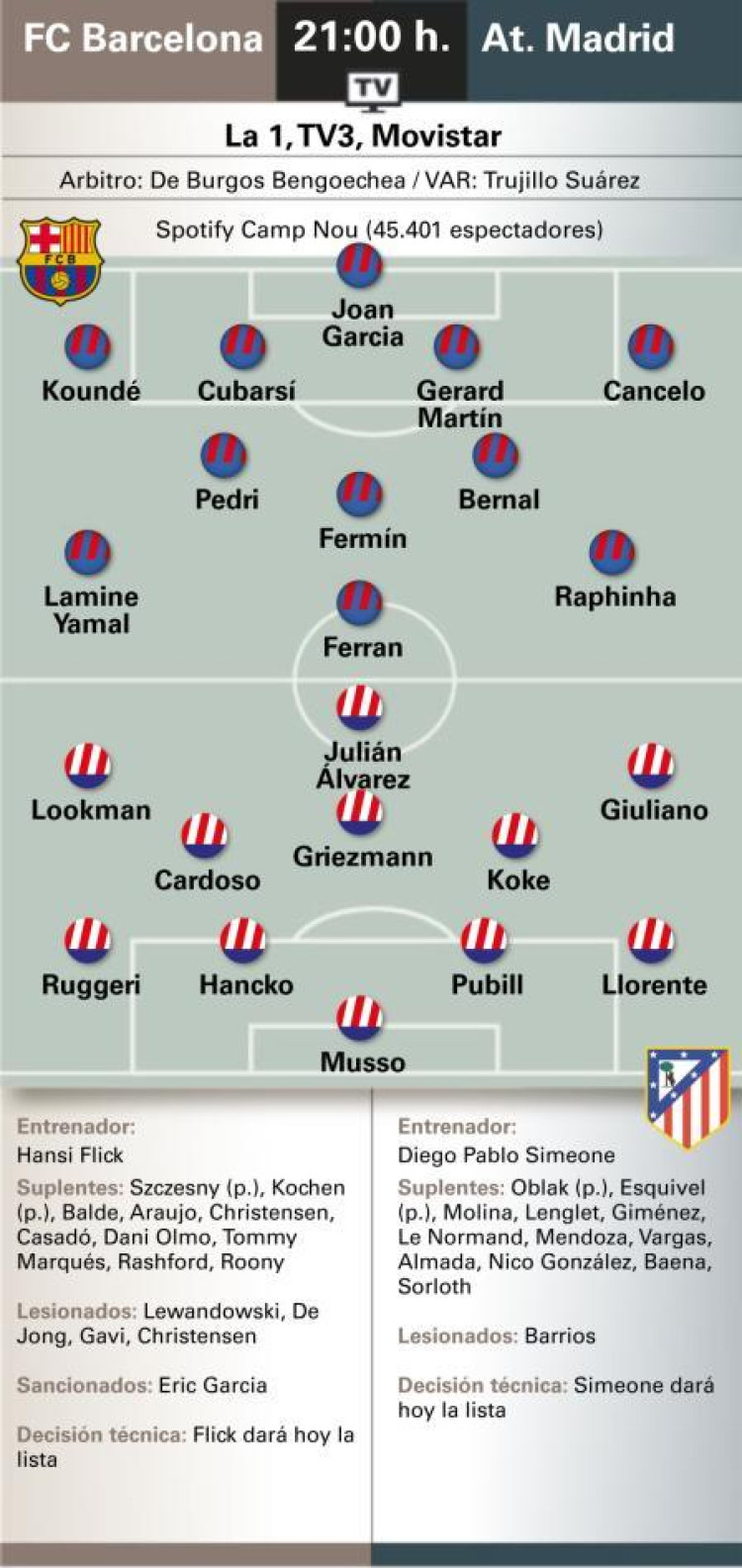 Diario AS predict starts for Martin, Bernal and Pedri as a result. Atleti have everyone fit, with Barrios back in the squad.