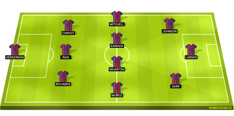 Probable Lineup (3-4-2-1): Henderson; Richards, Riad, Canvot; Munoz, Wharton, Kamada, Mitchell; Sarr, Johnson; Larsen