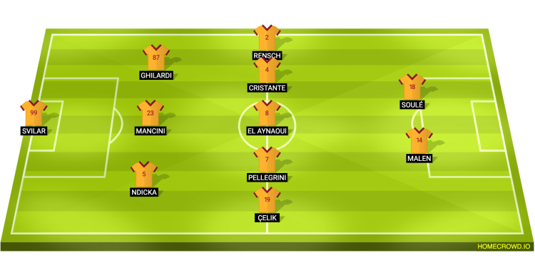 Probable Lineup (3-5-2): Svilar; Ndicka, Mancini, Ghilardi; Celik, Pellegrini, El Aynaoui, Cristante, Rensch; Malen, Soule