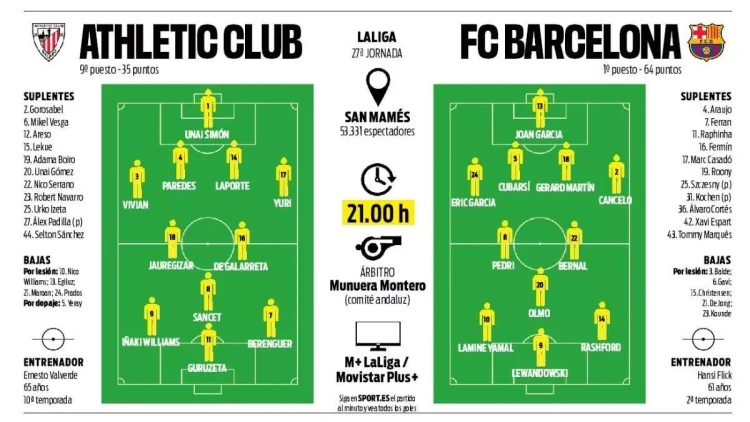 Despite having Andono Gorosabel, Jesus Areso and Inigo Lekue available, Sport believe that Dani Vivian will start at right-back, with Aymeric Laporte and Aitor Paredes in the centre of defence. Inigo Ruiz de Galarreta would partner Mikel Jauregizar and Oihan Sancet in midfield, while Inaki Williams and Alex Berenguer would flank Gorka Guruzeta in attack.