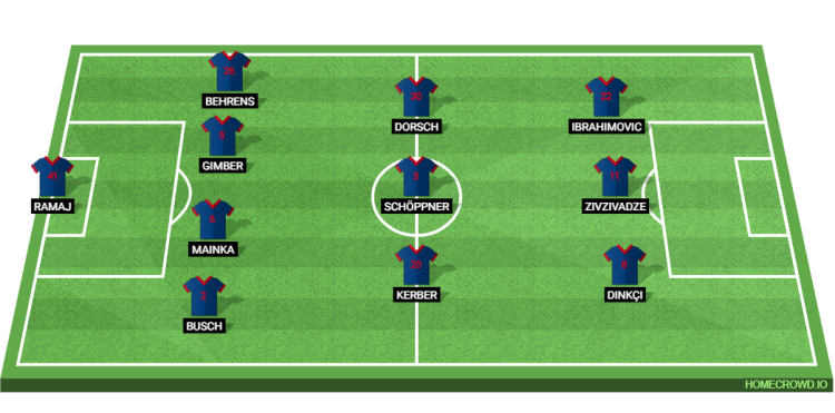 In midfield, Luca Kerber, Jan Schoppner and Niklas Dorsch should form a compact three, aiming to provide both defensive cover and transitions into attack. The front three is expected to feature Eren Dinkci on the right wing, Budu Zivzivadze through the centre as the main striker, and Arijon Ibrahimovic operating from the left, offering creativity and movement in the final third.