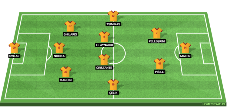 Mile Svilar is set to start in goal, protected by a back three comprising Gianluca Mancini, Evan Ndicka, and Daniele Ghilardi, each tasked with maintaining a compact defensive shape and dealing with transitions. On the flanks, Zeki Celik and Kostas Tsimikas are expected to operate as wing-backs, providing width and supporting both defensive recovery and attacking overlaps.